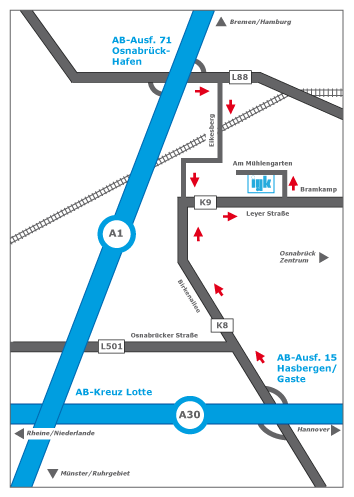 AB-Ausfahrt 15 Hasbergen/Gaste/Atter ausfahren. An der Ausfahrt abbiegen Richtung Rheine/ Ibbenbüren/Lotte/Atter. Nach 0,9 km im Kreisverkehr rechts die 1. Ausfahrt auf die Birkenallee nehmen. Bis zur abknickenden Vorfahrt 3,0 km geradeaus. Dann rechts abbiegen auf Leyer Strasse (auf der Vorfahrtsstrasse bleiben), nach 0,3 km nach links abbiegen auf Bramkamp, nach 0,1 km links abbiegen auf Am Mühlengarten. Besucherparkplätze stehen gegenüber des Büros zur Verfügung.